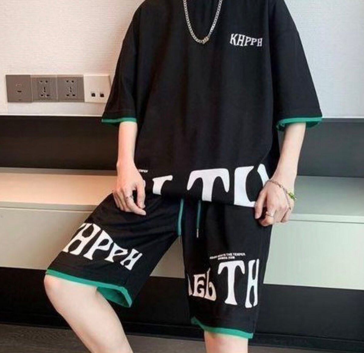 Survêtement homme noir avec t-shirt et short assortis. Confortable et élégant, idéal pour les activités sportives ou décontractées. Tissu de qualité, coupe ample.