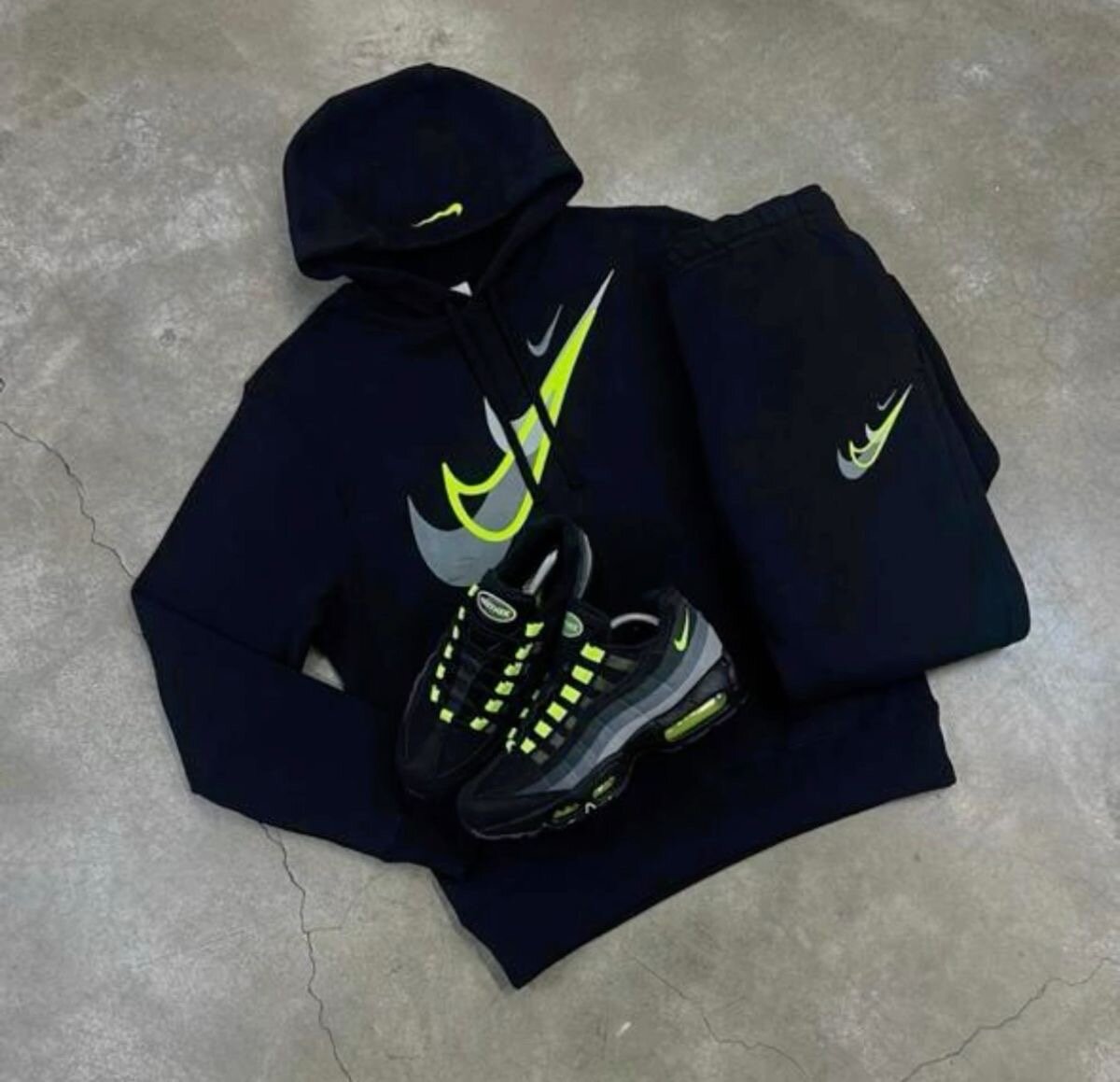 Découvrez cet ensemble survêtement Nike comprenant un sweat à capuche et un pantalon assorti, accompagné de baskets Nike noires avec accents jaunes. Parfait pour le sport ou le quotidien, cet ensemble est idéal pour les amateurs de mode streetwear.