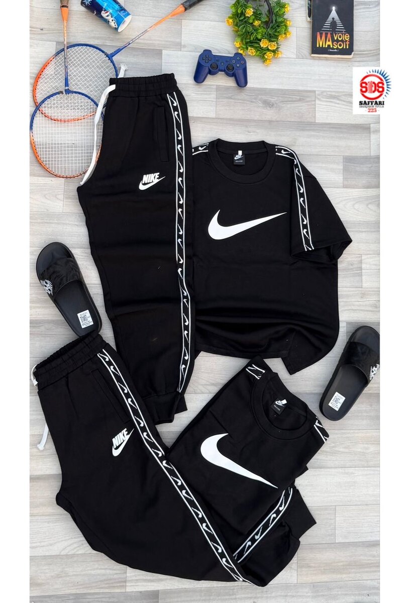 Ensemble survêtement Nike noir pour homme, confortable et élégant. Comprend un pantalon et une veste avec logo Nike. Parfait pour le sport et le quotidien.