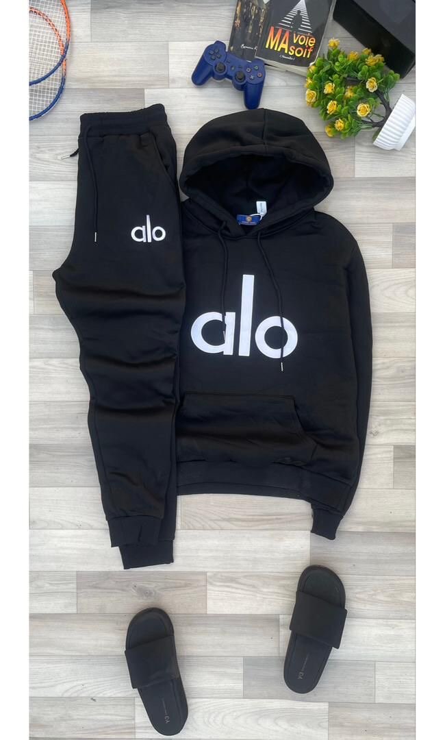 Survêtement noir confortable avec capuche et 'alo' imprimé. Idéal pour le sport ou les sorties décontractées. Conçu pour les hommes actifs.