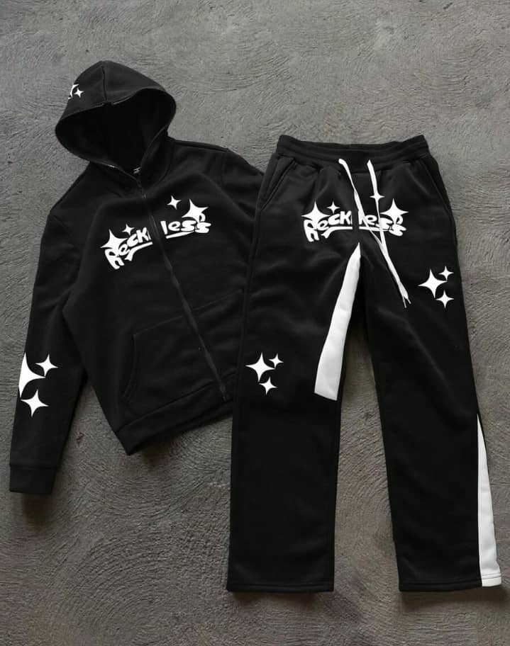 Ensemble survêtement noir et blanc avec capuche et motif étoiles. Idéal pour le sport ou les sorties décontractées. Confortable et tendance.