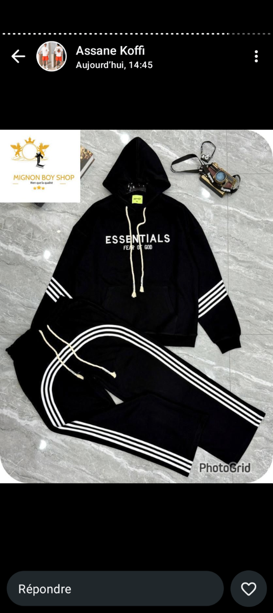 Découvrez notre ensemble de survêtement noir "Essentials" avec capuche. Confortable et stylé, parfait pour le sport ou les sorties décontractées. Matériaux de qualité pour un confort optimal.