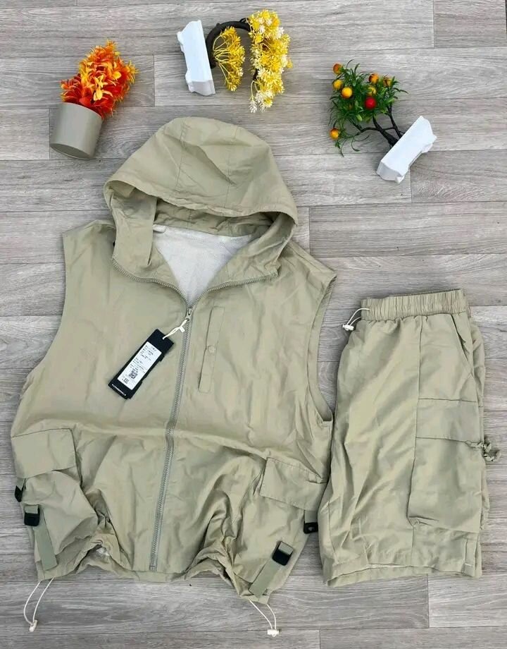 Survêtement sans manches avec capuche et shorts assortis. Idéal pour le sport et les activités décontractées. Conçu pour le confort et la mobilité.