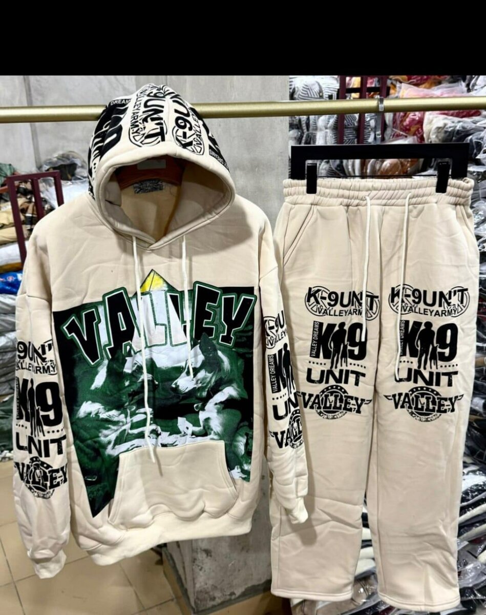 Ensemble survêtement VALLEY K9 UNIT pour homme. Conçu pour le confort et le style, cet ensemble comprend un sweat à capuche et un pantalon assorti. Imprimés avec des graphiques audacieux, ces vêtements sont parfaits pour un usage quotidien ou pour des activités sportives.