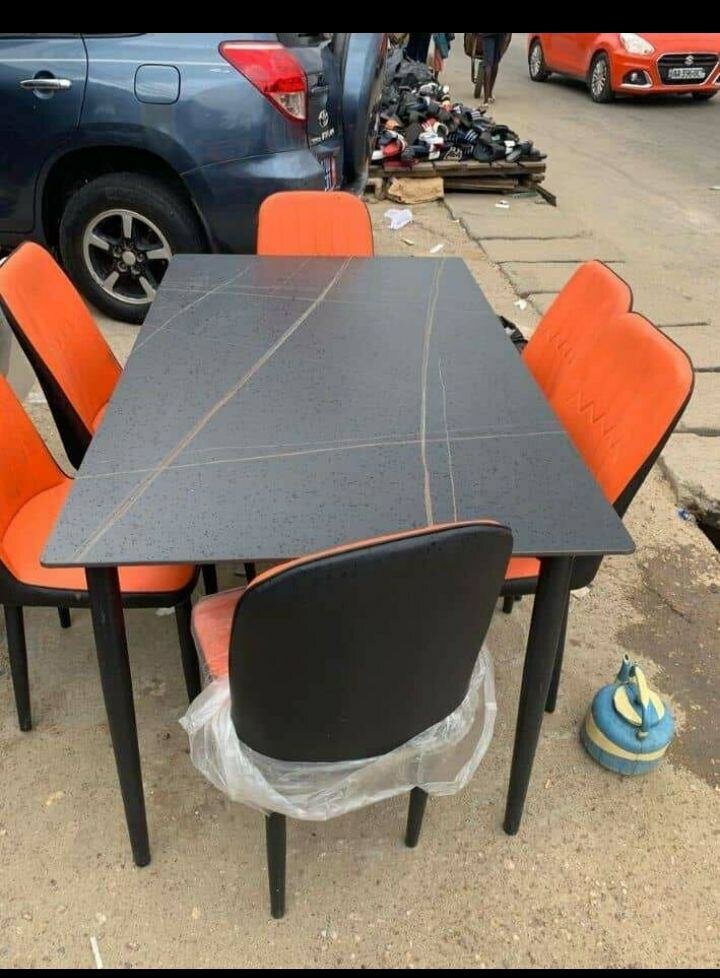 Découvrez notre ensemble table et chaises design pour une salle à manger moderne. Table en marbre noir avec des chaises orange et noir. Matériau de haute qualité, design élégant.