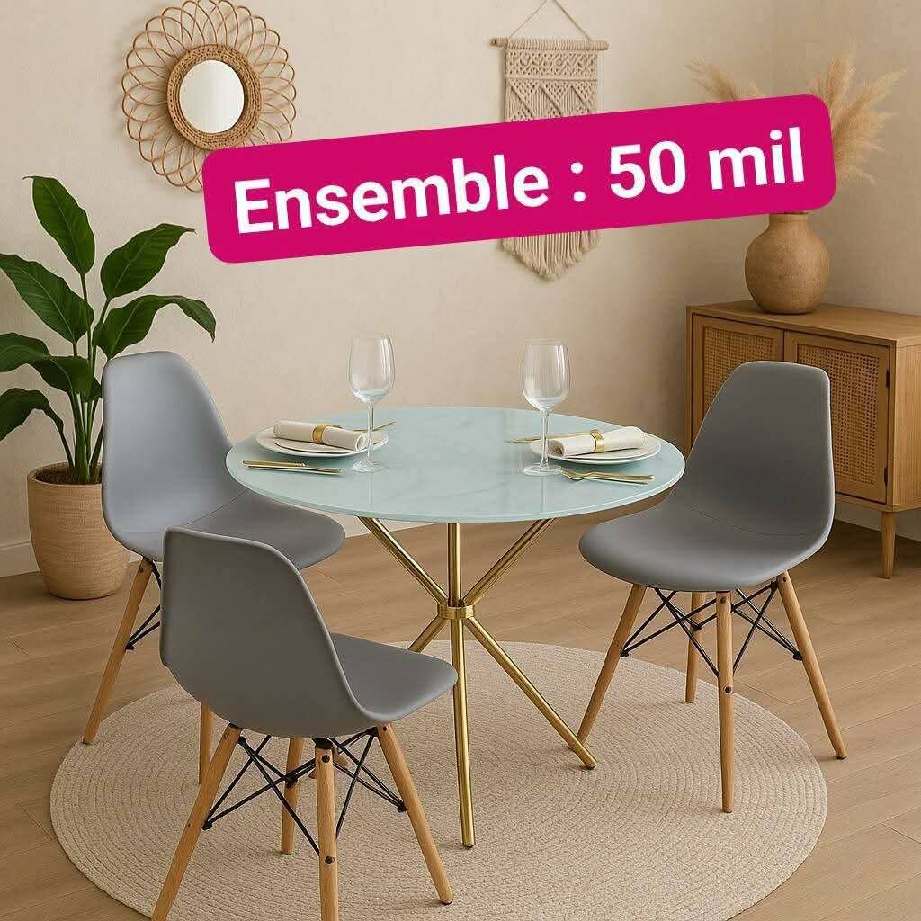 Découvrez cet ensemble élégant composé d'une table en verre et de quatre chaises au design moderne, idéal pour un salon contemporain ou une salle à manger ouverte. Les pieds en bois ajoutent une touche naturelle et s'harmonisent parfaitement avec le décor intérieur. Ce set transforme instantanément votre espace en un lieu chaleureux et accueillant, parfait pour partager des repas en famille ou entre amis.