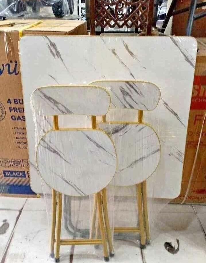 Ensemble élégant de table et chaises pliantes, idéal pour les petits espaces. Finition marbre sophistiquée et structure dorée robuste. Parfait pour les balcons, cuisines ou salles à manger compactes. Pratique et facile à ranger.