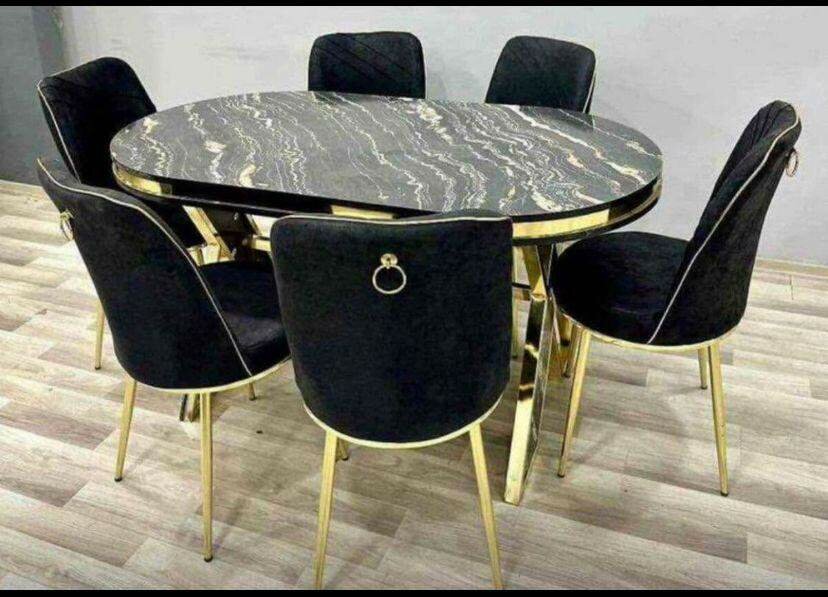 Élégant ensemble de salle à manger comprenant une table ronde avec dessus en marbre noir et des chaises noires avec pieds dorés. Parfait pour les dîners en famille ou entre amis.
