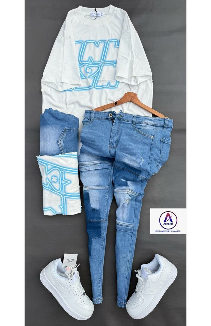 Découvrez cet ensemble moderne comprenant un t-shirt imprimé et un jean décontracté. Parfait pour une sortie entre amis ou une journée de détente. Complétez votre look avec des baskets blanches pour un style urbain et confortable. Idéal pour ceux qui veulent allier style et confort au quotidien.