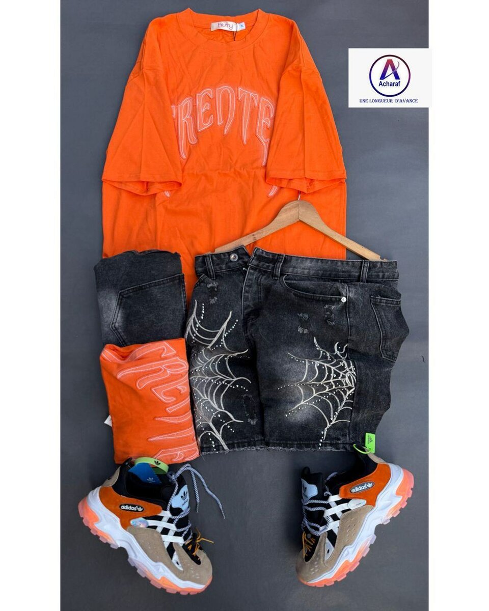 Exprimez votre style audacieux avec cet ensemble urbain vibrant. Comprend un t-shirt orange avec un motif unique, un short en jean noir avec une impression de toile d'araignée et des baskets sportives orange et noires. Parfait pour les sorties décontractées et les événements branchés. Ajoutez une touche contemporaine et funky à votre garde-robe!