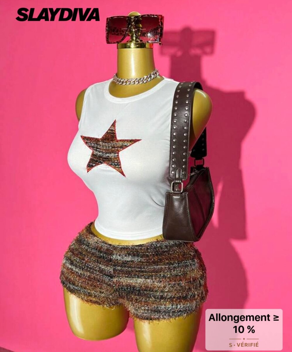 Craquez pour cet ensemble tendance composé d'un top ajusté orné d'une étoile et d'un short texturé. Idéal pour un look décontracté et stylé cet été. Parfait pour les sorties entre amis ou un moment de détente à maison. Style et confort réunis pour un look unique.