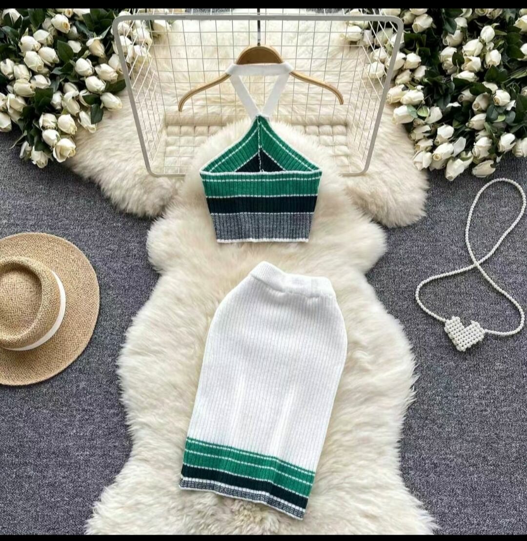Découvrez cet ensemble tricoté chic pour femme, composé d'un haut dos-nu et d'une jupe taille haute. Avec ses nuances élégantes de vert et blanc, il est parfait pour un style estival décontracté mais sophistiqué. Confortable et stylé, cet ensemble est idéal pour les sorties entre amis ou les promenades au bord de la mer. Ajoutez une touche bohème à votre garde-robe avec ce look unique.