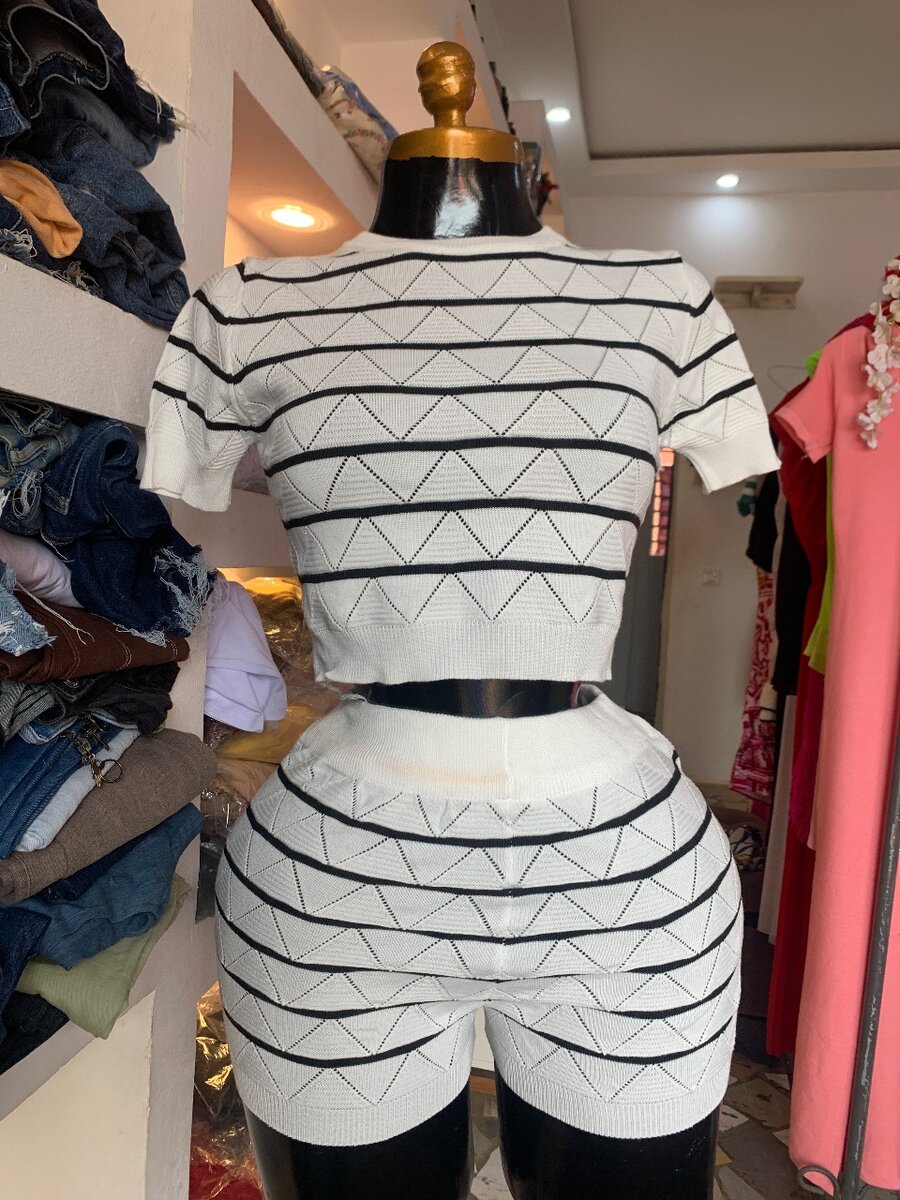 Cet ensemble tricoté pour femme, au design géométrique noir et blanc, est idéal pour un look tendance et confortable. Parfait pour les sorties estivales et les moments de détente à la maison. Féminin et moderne, ce set se compose d'un crop top et d'un short assorti. Un choix parfait pour un style décontracté et élégant.