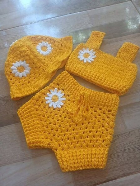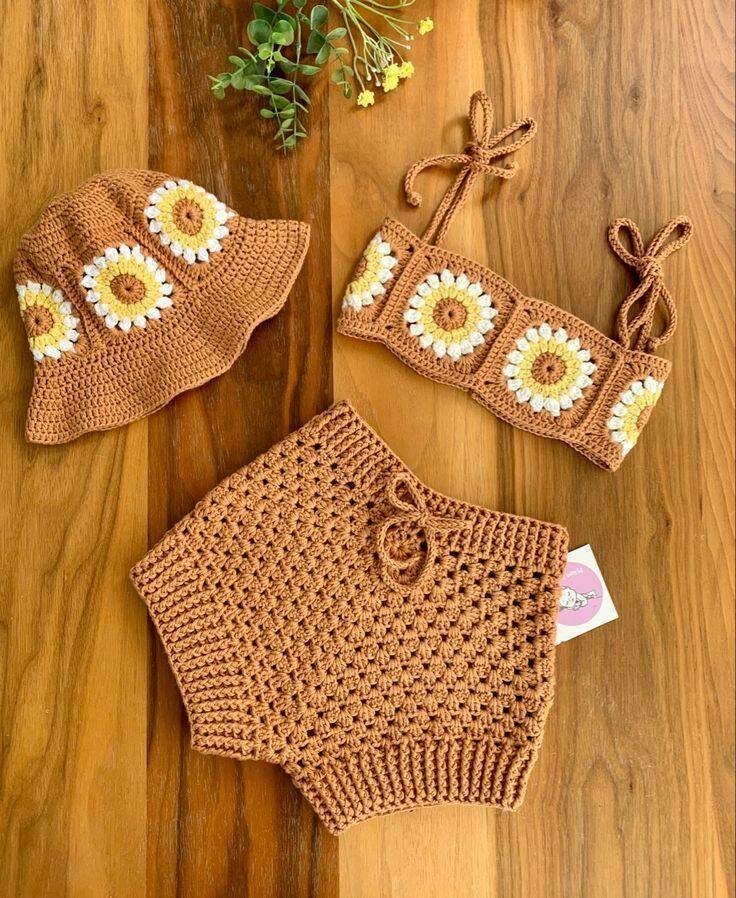 Cet ensemble tricoté brun est parfait pour l'été. Composé d'un haut à bretelles, d'un short et d'un chapeau décoré de motifs floraux, il offre confort et style. Idéal pour les journées ensoleillées à la plage ou au jardin. Conçu pour apporter une touche rétro et joyeuse à votre garde-robe estivale.
