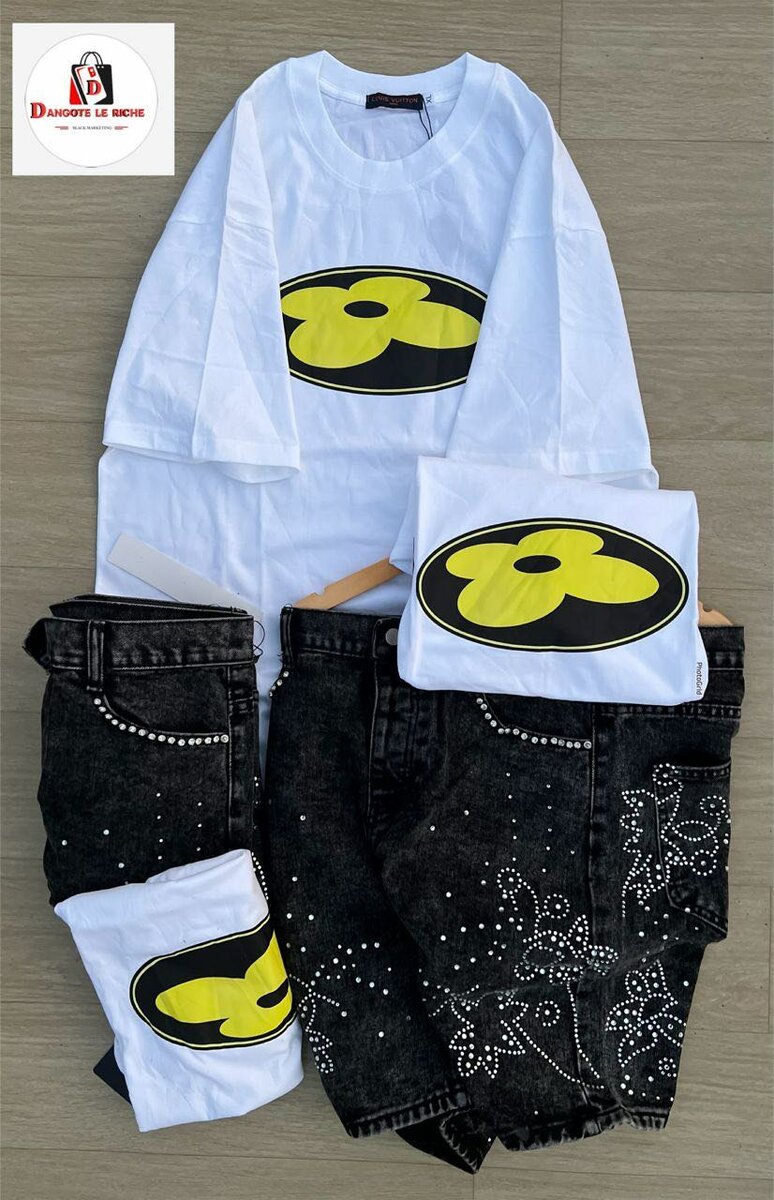 Optez pour cet ensemble moderne de t-shirt blanc à motif et jeans noirs ornés pour un look tendance et confortable. Idéal pour un style urbain chic, chaque pièce apporte une touche unique avec ses détails soignés.