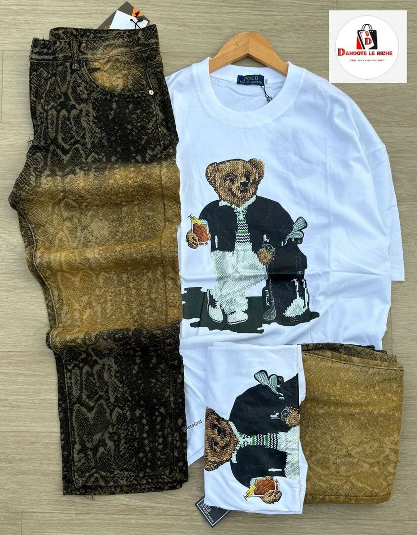 Découvrez cet ensemble moderne composé d'un t-shirt blanc orné d'un motif d'ours élégant et d'un pantalon à motif serpent. Idéal pour un look tendance et audacieux. Parfait pour les sorties décontractées ou les occasions spéciales. Qualité et style assurés!