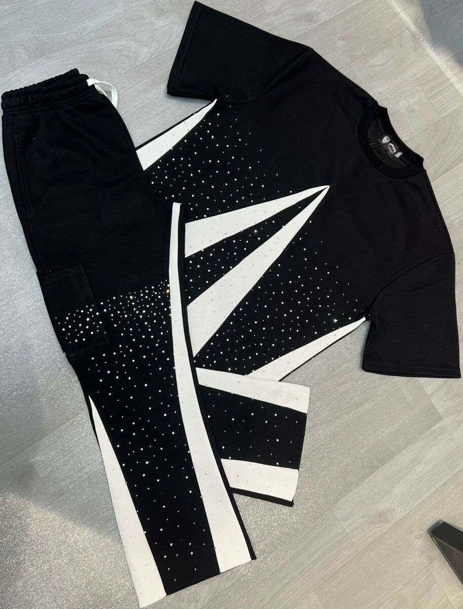 Ce superbe ensemble T-shirt et pantalon noir est orné de motifs géométriques blancs audacieux. Idéal pour un look moderne et tendance, il offre un confort exceptionnel pour un usage quotidien ou des sorties décontractées. Faites sensation avec ce style unique!