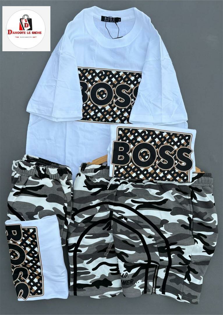 Optez pour cet ensemble tendance comprenant un T-shirt blanc avec logo "Boss" et un short camouflage. Parfait pour un look décontracté cet été, il combine confort et style urbain. Idéal pour des journées ensoleillées ou une sortie entre amis. Matières de qualité pour un usage prolongé. Un choix parfait pour ceux qui aiment la mode avec attitude.