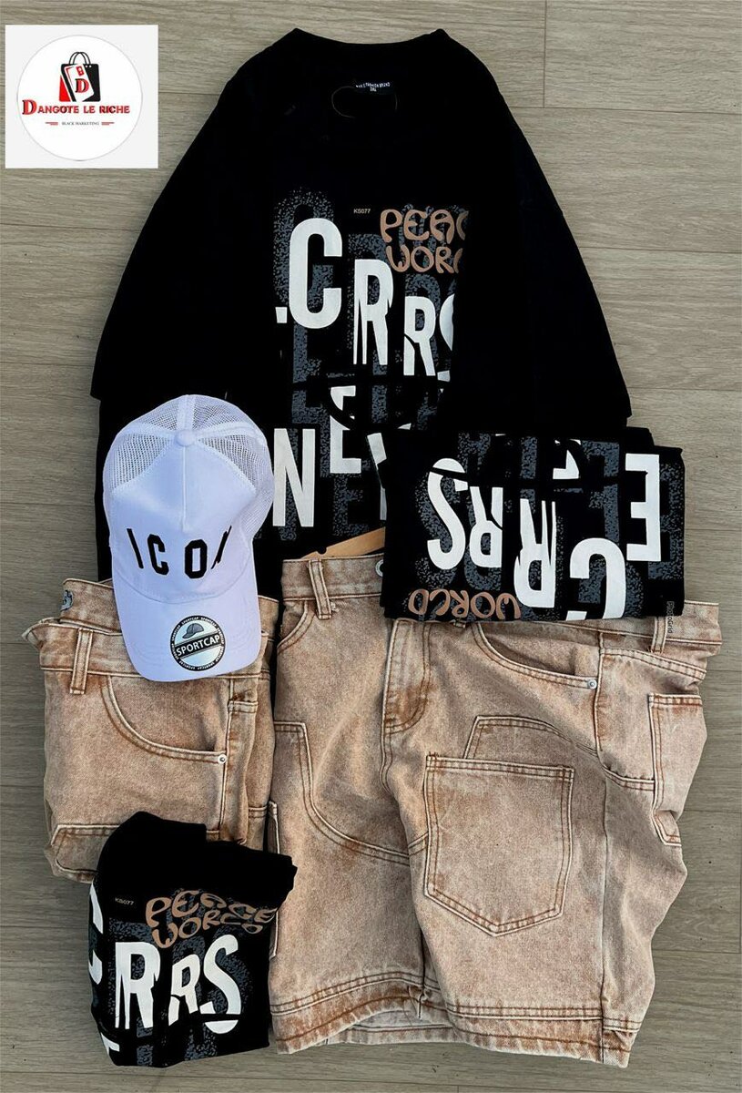 Optez pour cet ensemble élégant comprenant un t-shirt noir imprimé et un short en denim délavé. Idéal pour un look décontracté estival. Casquette non incluse.