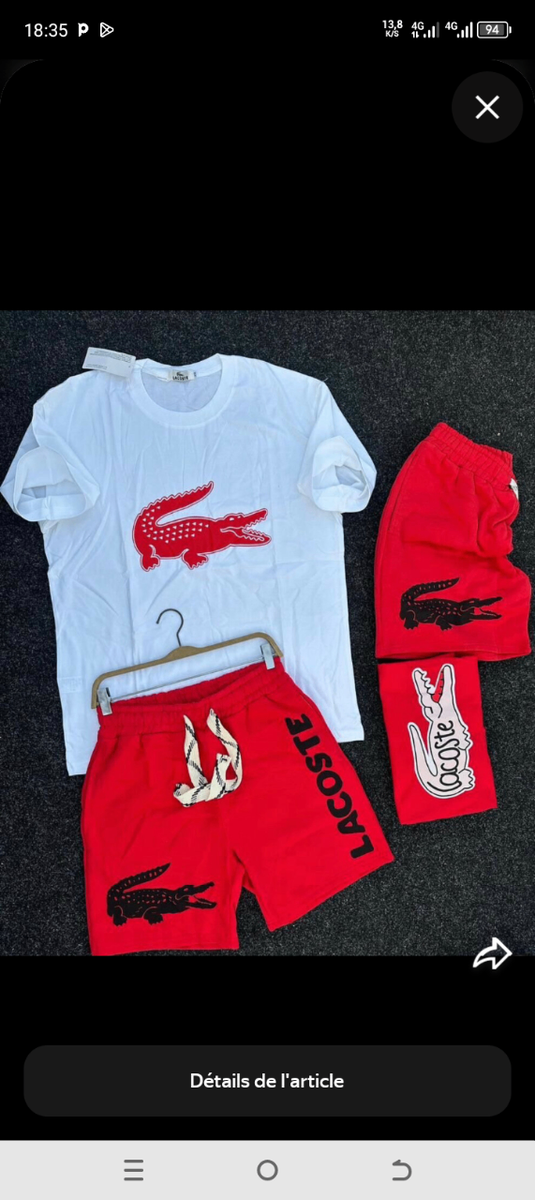 Optez pour cet élégant ensemble Lacoste, comprenant un T-shirt blanc et un short rouge. Parfait pour un look décontracté cet été, il allie confort et style avec le célèbre logo crocodile.