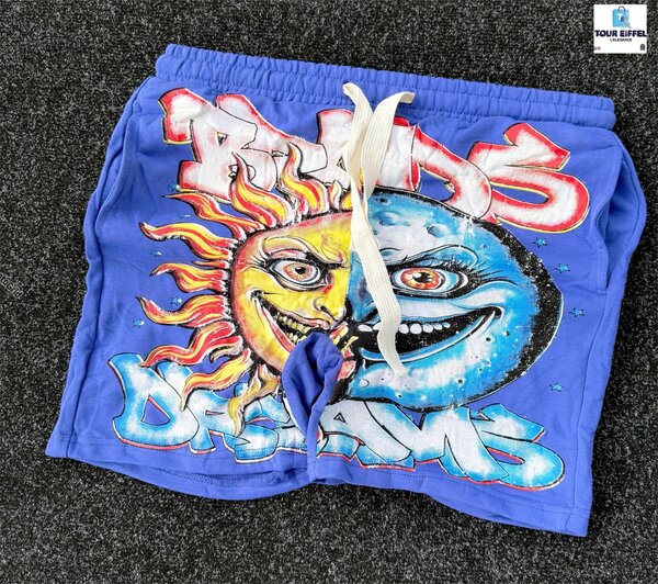 Découvrez notre ensemble audacieux et stylé, comprenant un T-shirt noir à imprimé graphique unique et un short bleu éclatant avec détails artistiques. Parfait pour une allure décontractée et tendance cet été.