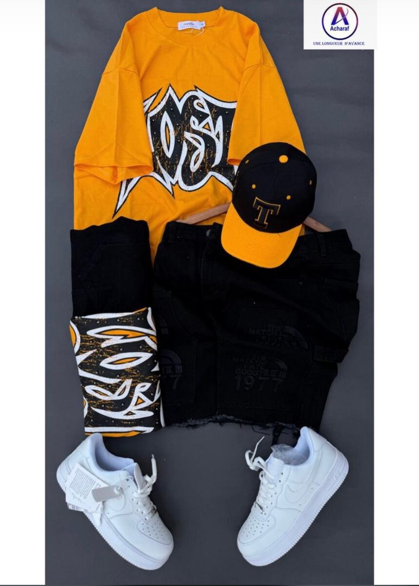 Découvrez notre ensemble urbain tendance, parfait pour un look décontracté. Avec un t-shirt graphique unique, un short en denim stylé, assortis avec des baskets confortables, cet ensemble est idéal pour les sorties en ville. Ajoutez une casquette pour compléter votre style.