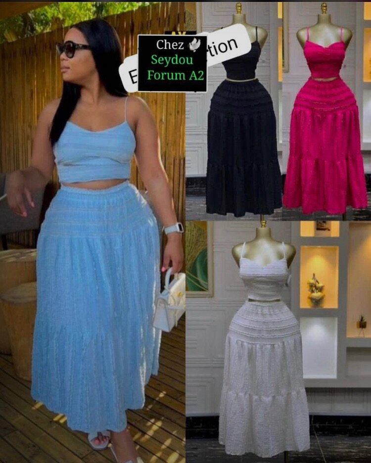 Découvrez cet ensemble élégant et estival pour femme, parfait pour les sorties et occasions spéciales. Disponible en plusieurs coloris, il allie confort et style avec un haut à fines bretelles et une jupe évasée. Idéal pour rester tendance tout en étant à l'aise.