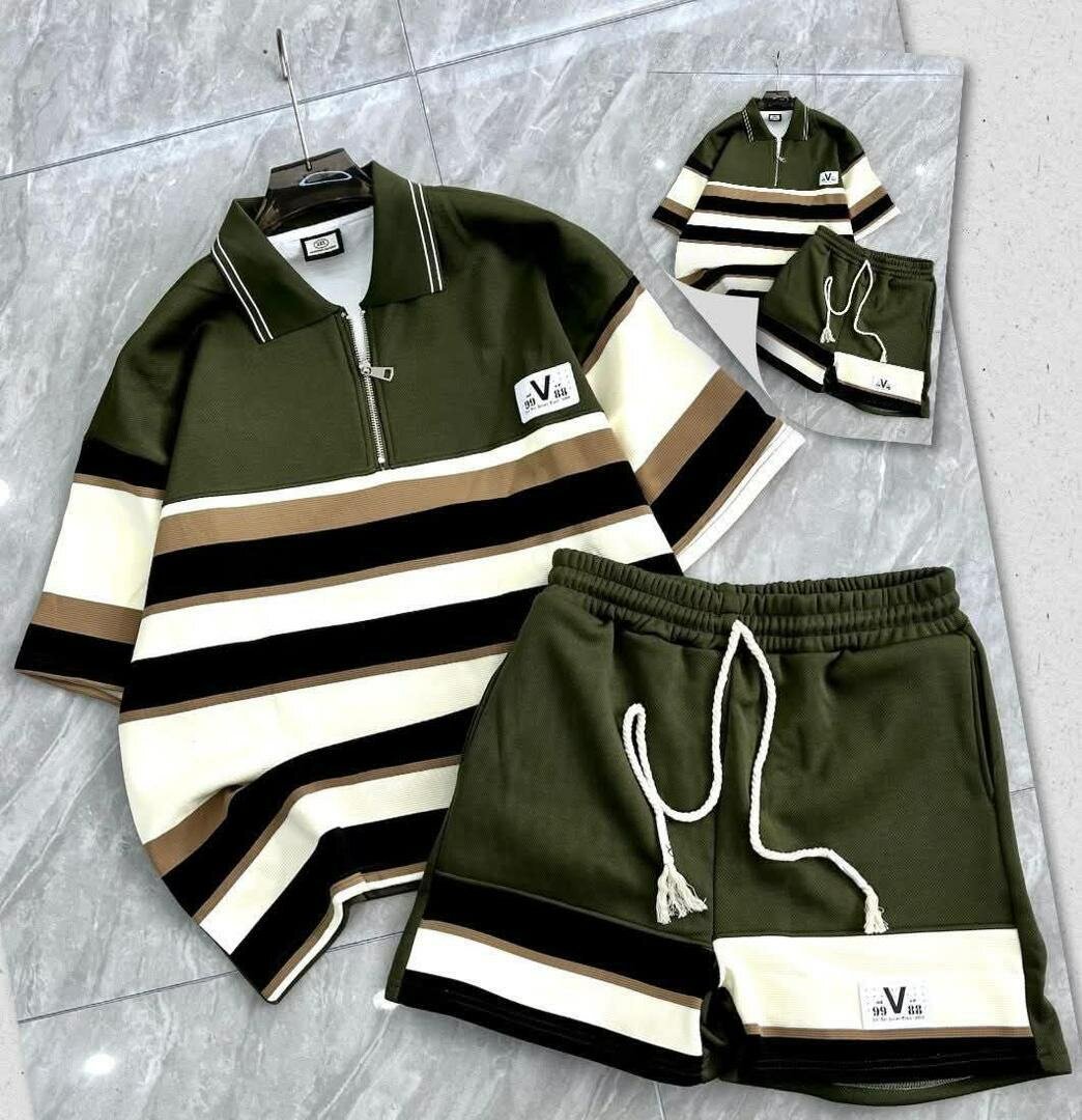 Ensemble veste et short pour homme, confortable et élégant. Disponible en vert et noir avec des rayures. Idéal pour le sport ou les activités décontractées.
