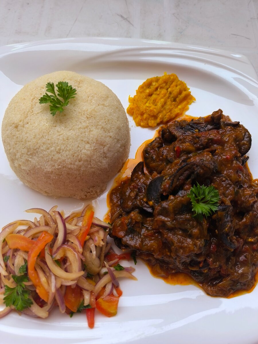 Escargots sauté assaisonné avec ses délicieux piments et de l'attiéké