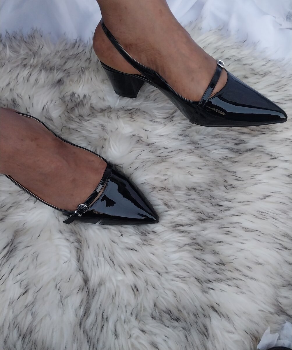 Escarpins grandes tailles à brides et lanière avec talon bloc . Importés de France, pointure 41 à 44 , noire