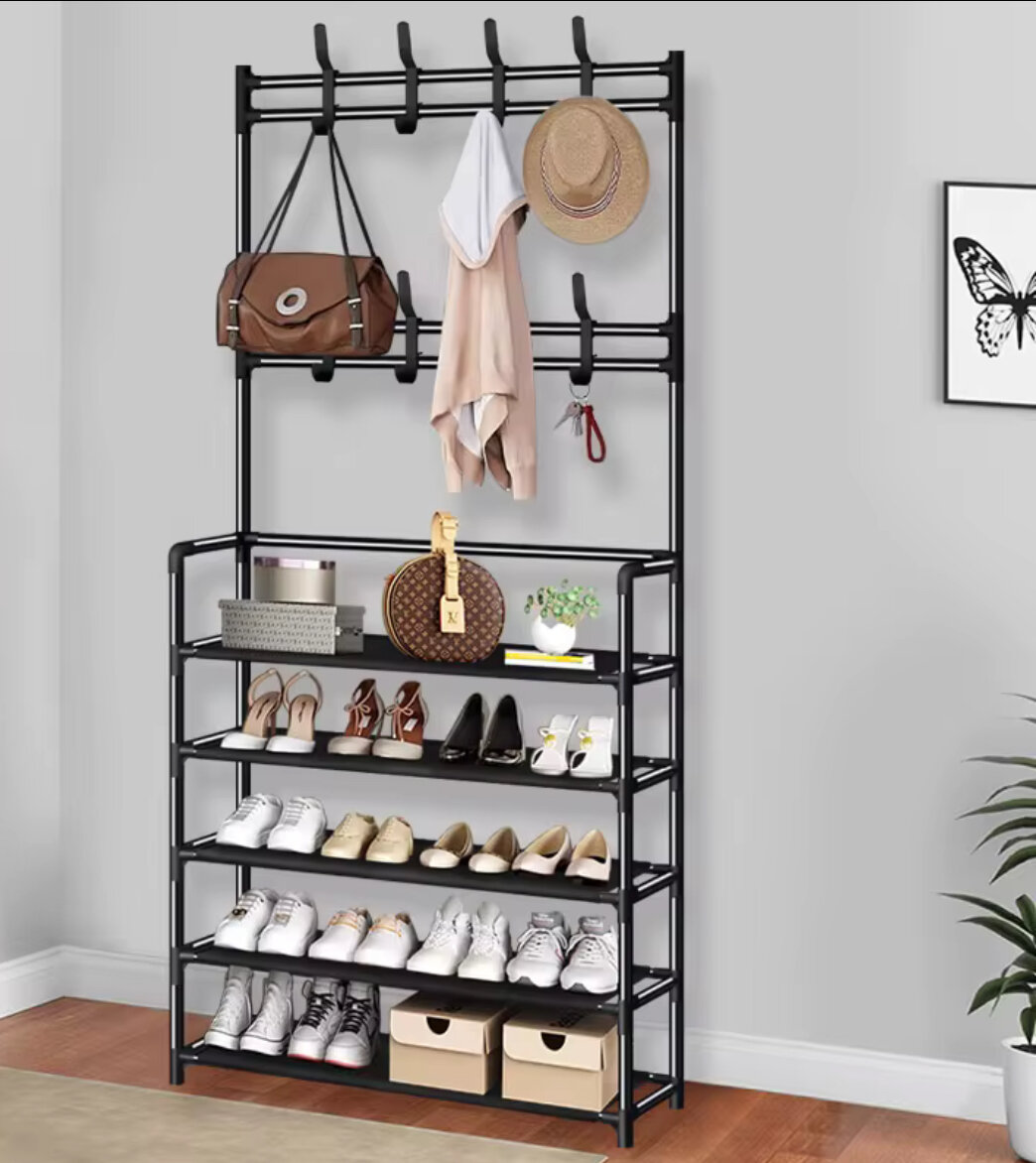 Optimisez votre espace avec cette étagère multifonctionnelle pour chaussures et manteaux. Parfaite pour l’entrée, elle organise vos chaussures, sacs et manteaux grâce à ses étagères spacieuses et ses crochets robustes. Design élégant et moderne qui s'intègre harmonieusement dans tout intérieur.