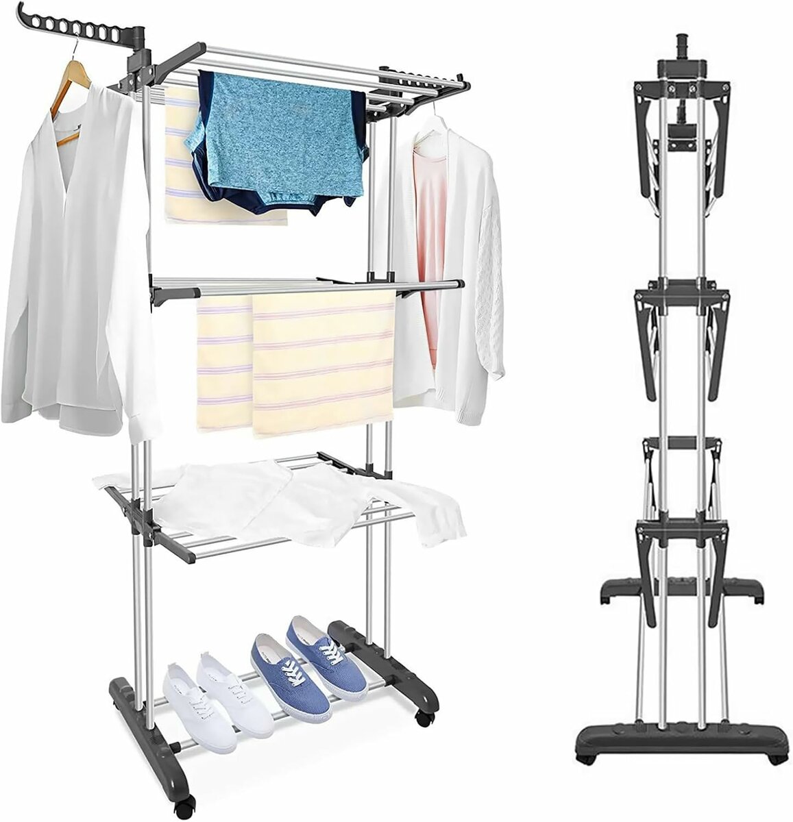 Optimisez l'espace avec cette étagère de séchage repliable en inox. Idéale pour vêtements et chaussures, elle est mobile et compacte. Parfaite pour petits espaces et balcons!
