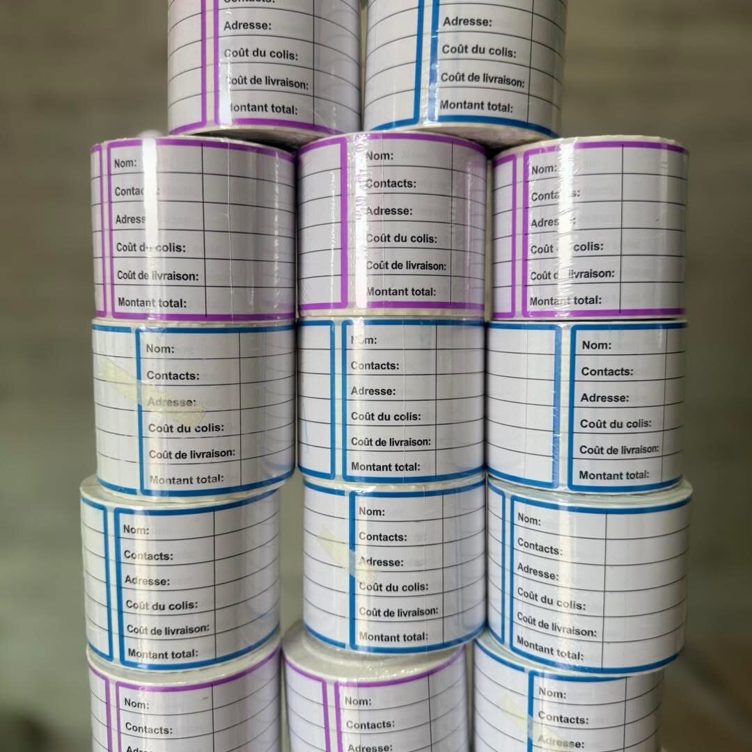 Lot d'étiquettes autocollantes pour colis, idéal pour l'organisation et l'envoi. Avec sections pour nom, adresse et coûts, il facilite le suivi et l'administration des colis. Adapté pour bureaux et entreprises de logistique.