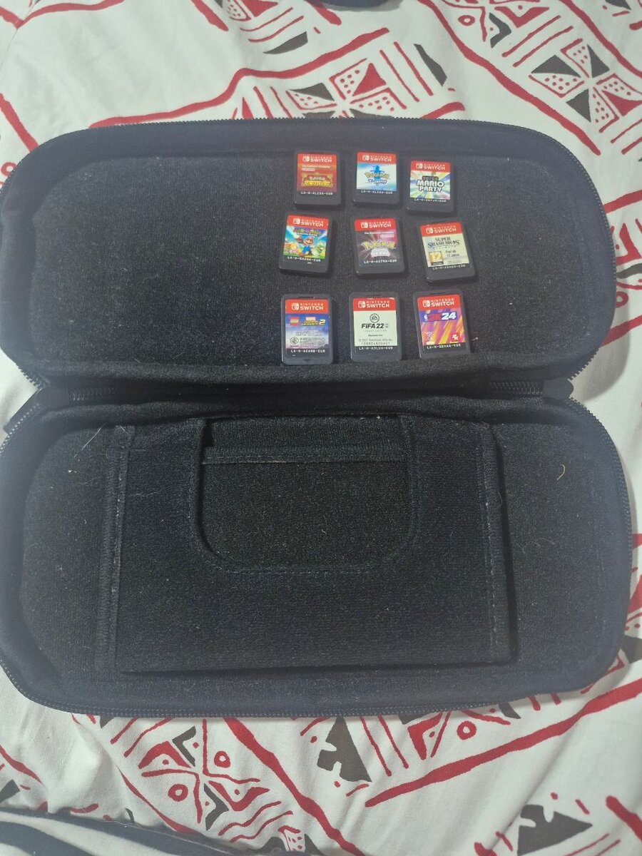 Cet ensemble comprend un étui de protection robuste pour Nintendo Switch et plusieurs cartouches de jeux. Parfait pour les fans de jeux souhaitant emporter leur console partout. Protégez votre Switch tout en gardant vos jeux préférés à portée de main. Idéal pour les voyages et le rangement sécurisé. Un must-have pour chaque joueur de Nintendo Switch!