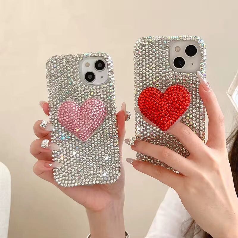 Ajoutez une touche glamour à votre iPhone avec ces étuis luxueux sertis de strass et ornés d'un cœur vibrant. Parfait pour protéger et styliser votre téléphone.
