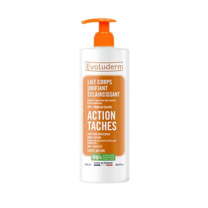Experience radiant skin with Evoluderm Brightening Body Lotion. This unifying formula, enriched with AHA and carrot oil, effectively reduces dark spots. Perfect for a visibly brighter and even skin tone. Suitable for daily use. Made in France for premium quality.