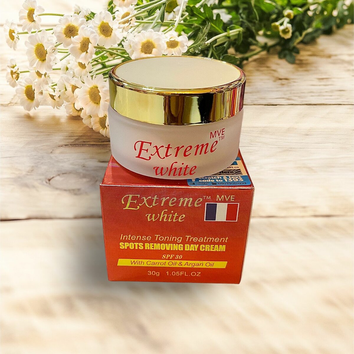 Extreme White Spot removing day cream effectively softens and clears all spots. Contains plant extracts work together to bring immediate relief and long-lasting moisturization. protects the skin against the daily aggressions, pollution, wind, cold. Clarifies your complexion and gives it back its brightness.