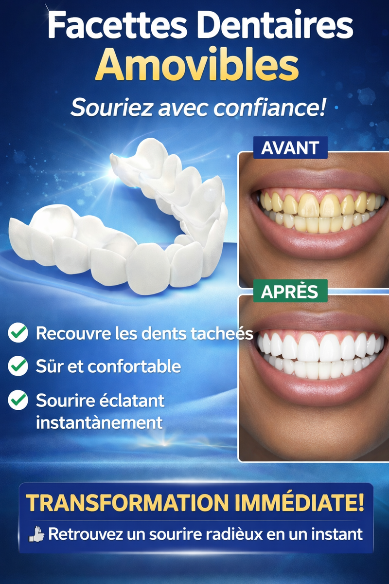 Transformez votre sourire instantanément avec nos facettes dentaires amovibles. Dizzy fix vous permet de sourire avec confiance en cachant vos dents tachées. Confort assuré pour un sourire éclatant et immédiat. Parfait pour toutes occasions spéciales.