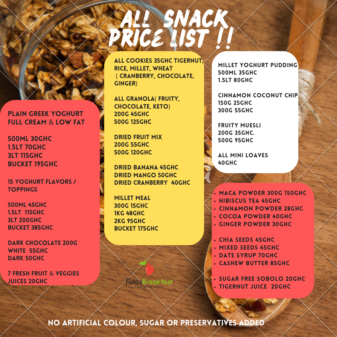 Our price list for all healthy snacks Weve got over 50 (sugar & White flour FREE) snacks available daily You can't Get BORED with our Wholesome SNACKS
