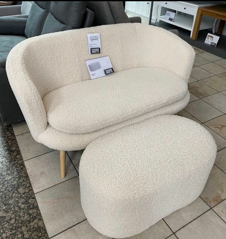Découvrez ce fauteuil moderne en tissu bouclé blanc, parfait pour créer un coin salon élégant et confortable. Son design arrondi et ses lignes épurées s'intègrent parfaitement dans un intérieur contemporain. Livré avec son repose-pied assorti.