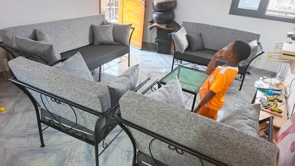 ensemble de fauteuil en fer forgé de sept places confortable résistant durable avec garantie , composé en un divan de trois places un divan de deux places deux fauteuils d'une place et la table basse