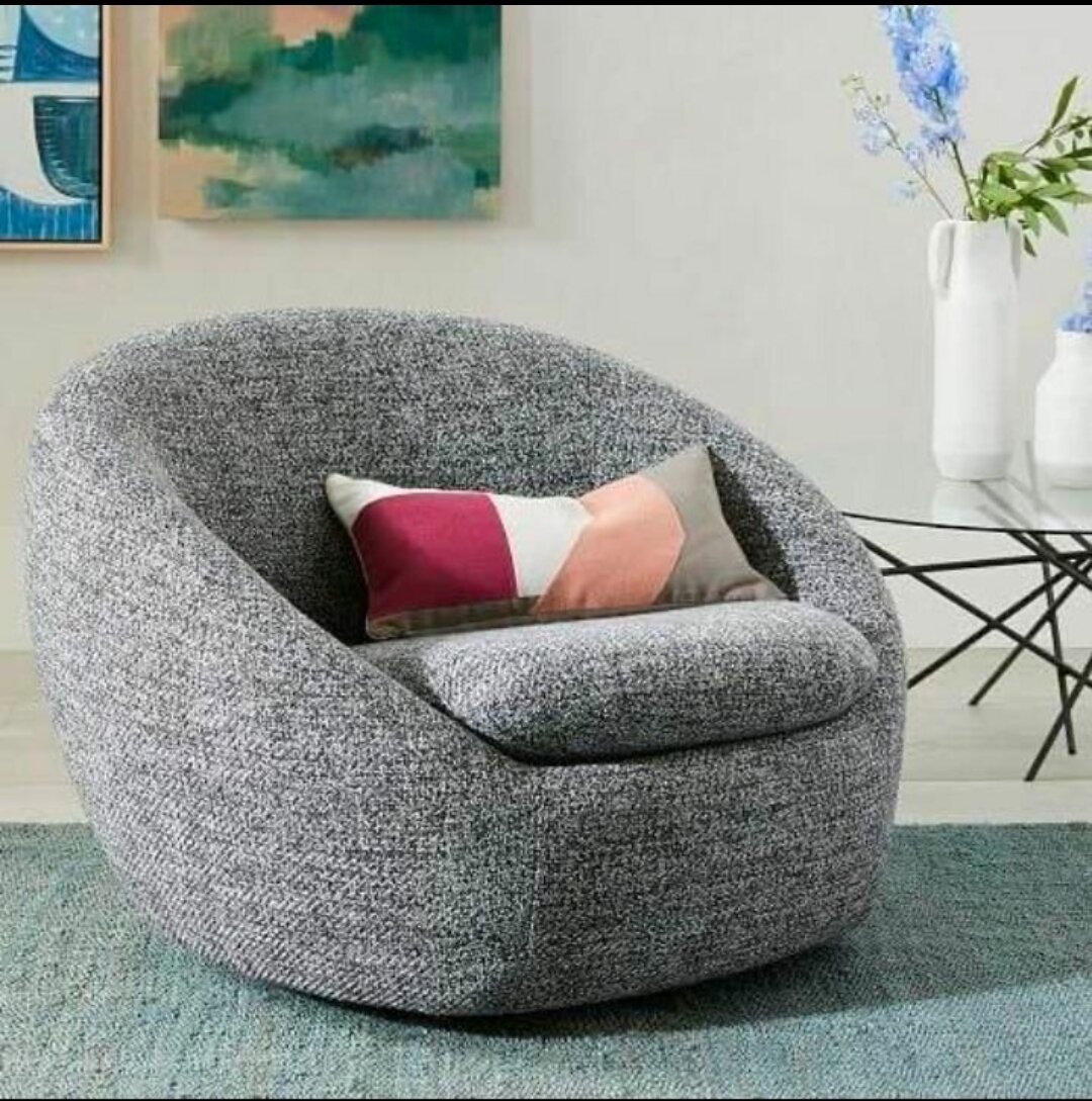 Fauteuil rond confortable en tissu gris avec un coussin décoratif. Idéal pour une ambiance cocooning dans votre salon ou chambre.
