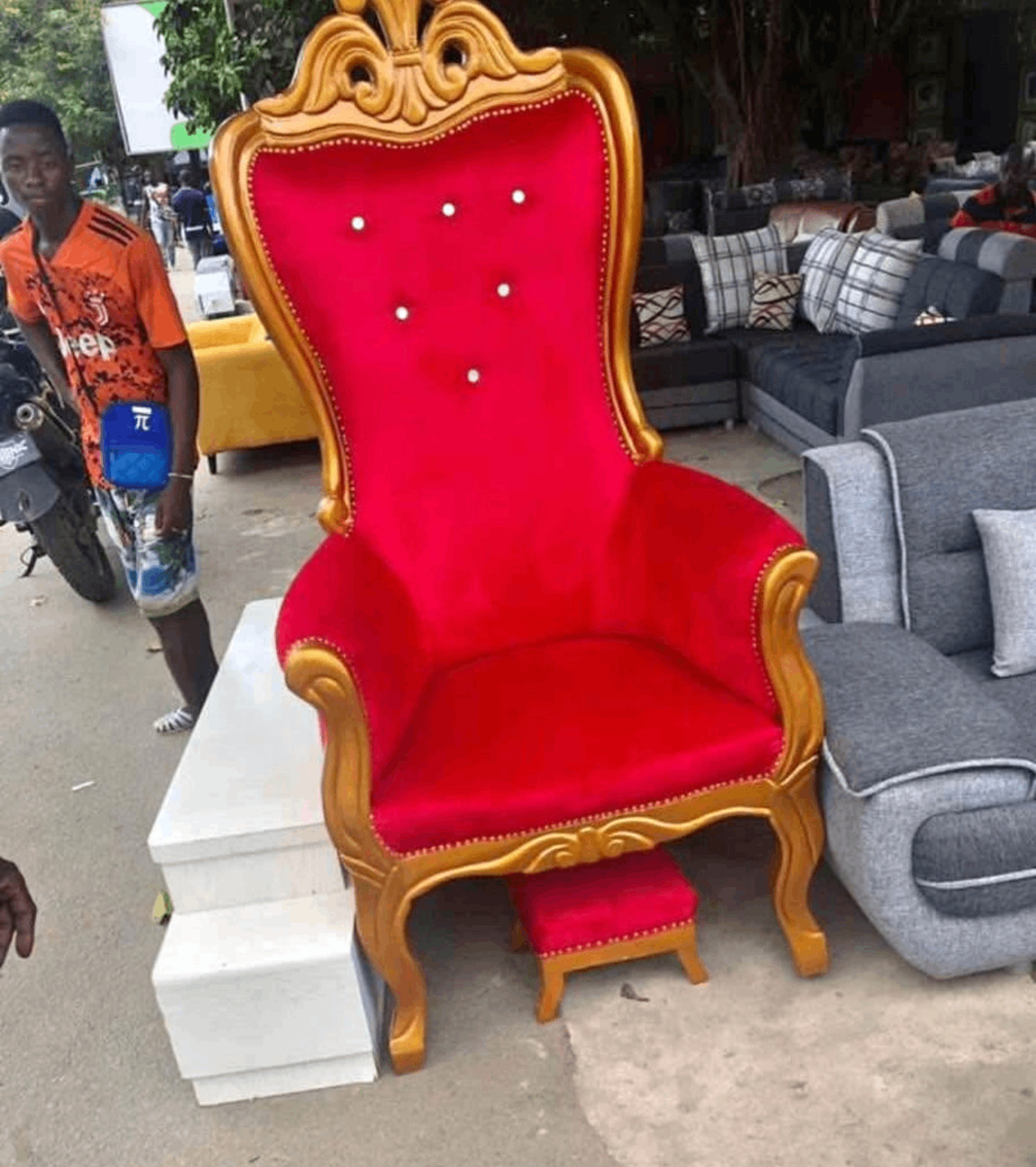Magnifique fauteuil de luxe en tissu rouge et bois doré, accompagné d'un repose-pied. Parfait pour une décoration intérieure somptueuse et élégante.