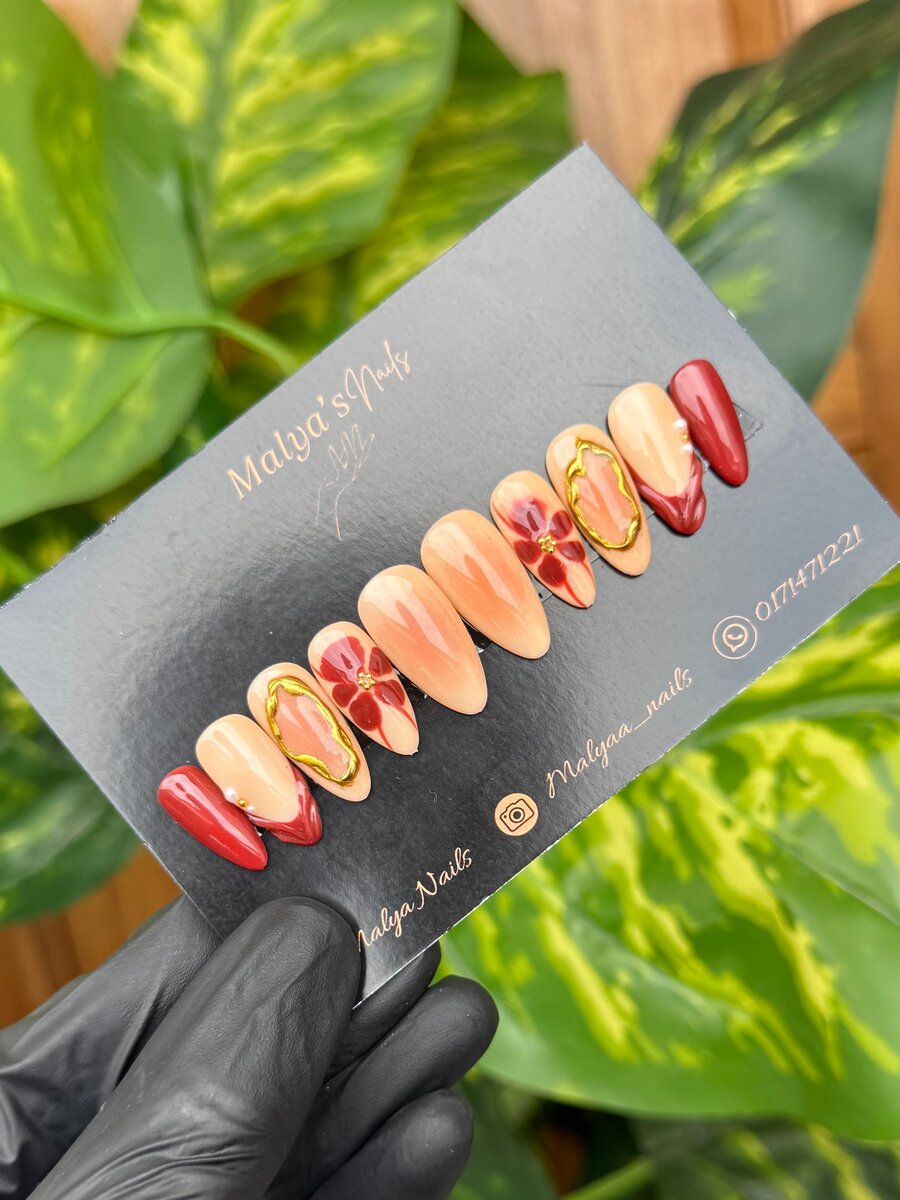 Transformez votre look avec ces faux ongles artistiques ornés de motifs floraux et de détails dorés.