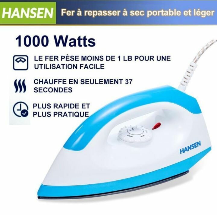 Découvrez le fer à repasser portable Hansen, léger et puissant à 1000W. Parfait pour un usage rapide avec un chauffage en 37 secondes. Idéal pour une utilisation quotidienne à domicile ou en voyage.