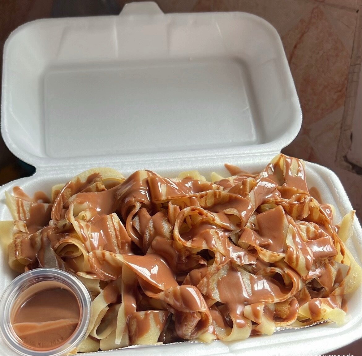 Savourez ces crêpes gourmandes garnies d'une généreuse sauce chocolatée et agrémentées de morceaux de chocolats et biscuits croquants.