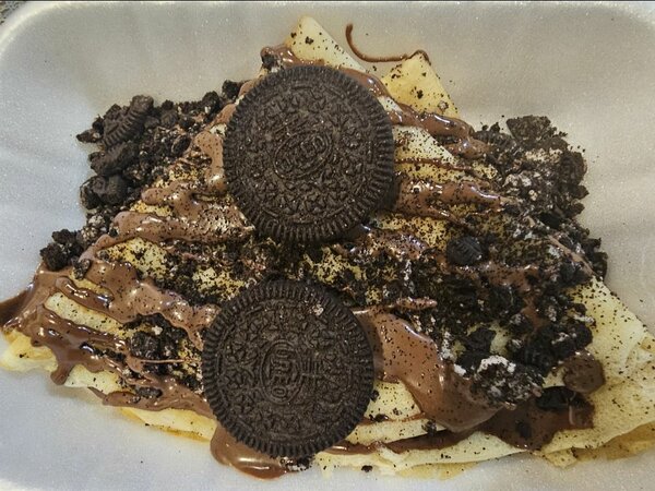 Savourez une crêpe irrésistible garnie de chocolat fondant et biscuits Oreo croquants. Parfaite pour une pause gourmande!
