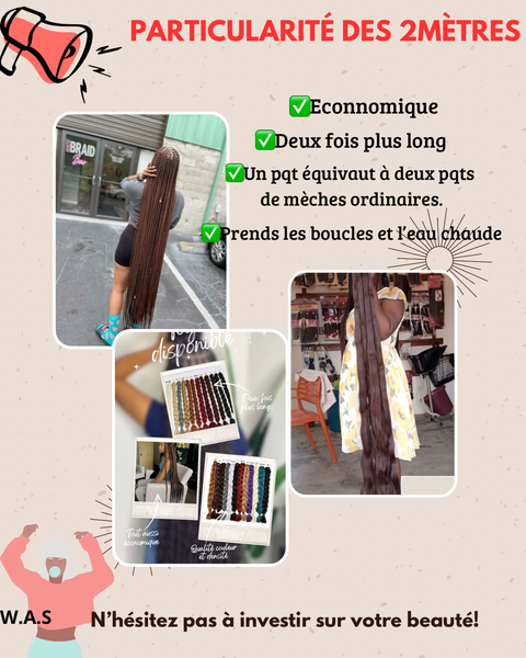 Complétez votre look avec ces magnifiques tresses ombrées de 2mètres. Parfaites pour des coiffures tressées élégantes, elles offrent une variété de couleurs pour un style unique. Idéales pour un usage quotidien ou des occasions spéciales, ces extensions de cheveux sont faciles à poser et agréables à porter.