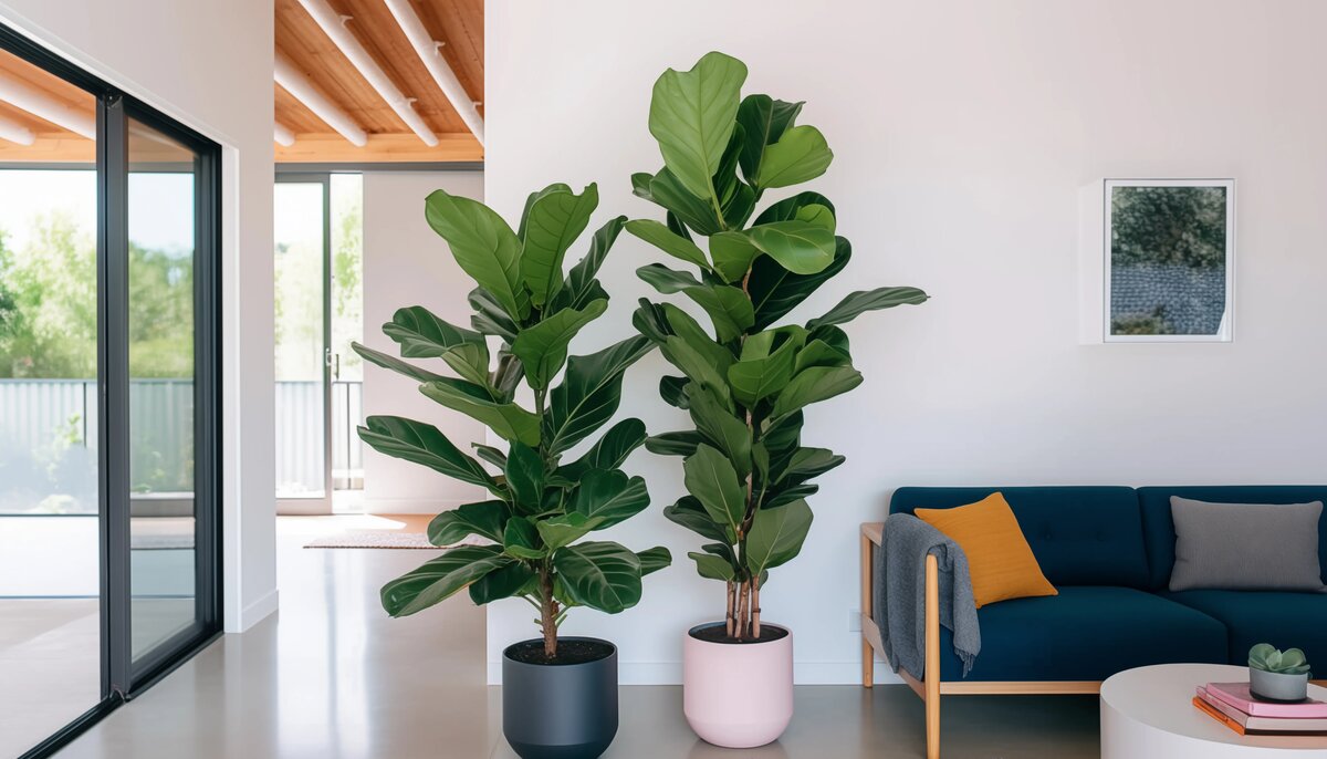 With its bold, dark green leaves shaped like a fiddle, the fiddle leaf fig makes a dramatic statement in any room, adding a modern, tropical vibe to interiors.