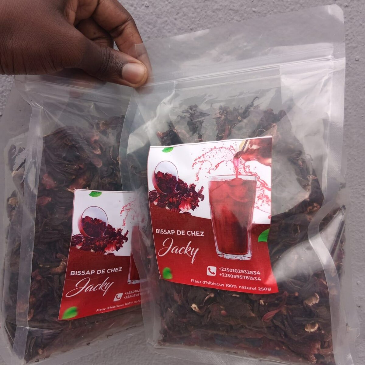 Découvrez les fleurs d'hibiscus séchées "Bissap de Chez Jacky", 100% naturelles, parfaites pour préparer de délicieuses boissons rafraîchissantes.